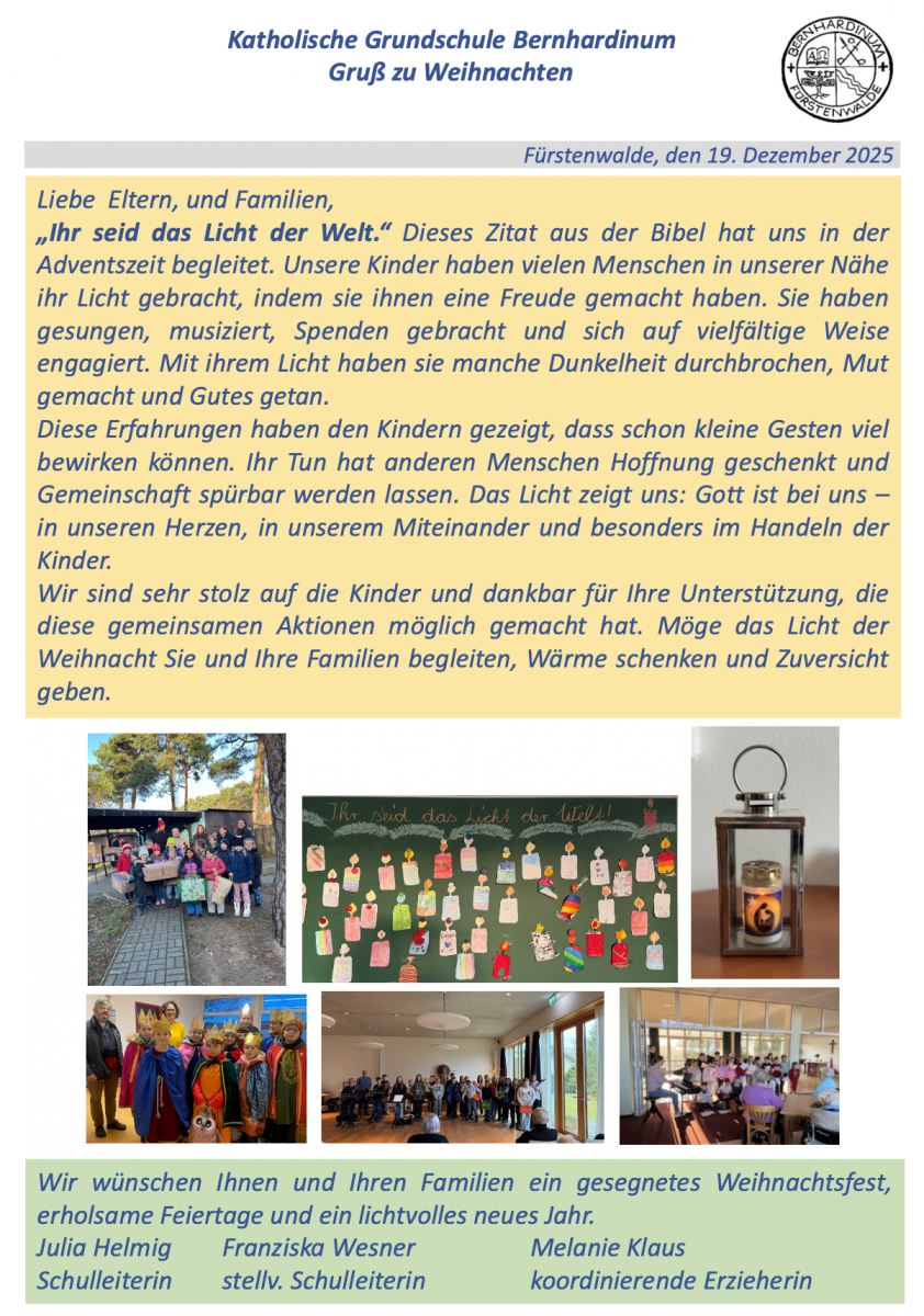 Ferner möchten wir daran erinnern, dass das Schulzentrum am 5.01.2026 auf Grund