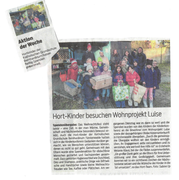 Im Vorfeld hatten die Eltern jede Menge Sachspenden in den Hort gebracht. Dank ihrer Hilfsbereitschaft kamen viele dringend benötigte Dinge zusammen, die nun den Menschen im Wohnprojekt Luise und der Obdachlosenunterkunft zugutekommen.